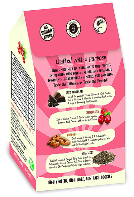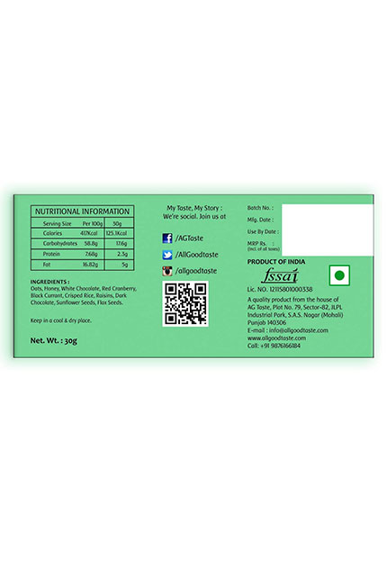 A zesty mixture of golden raisins, red cranberries, black currants and chocolate bound in honey and oats for a snack that satisfies from the first bite till the very last. No added sugar or preservatives.