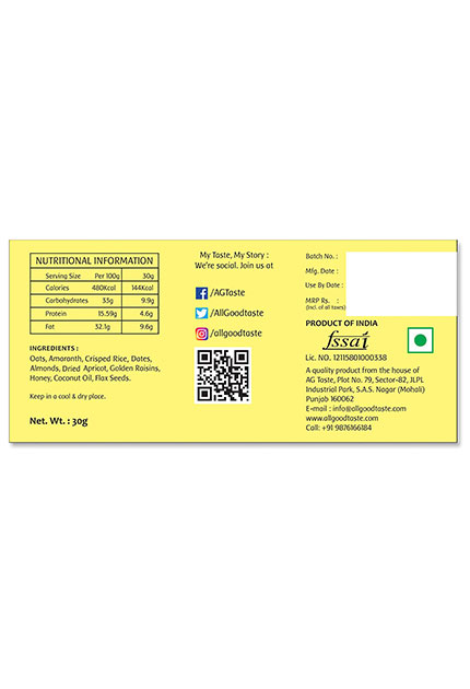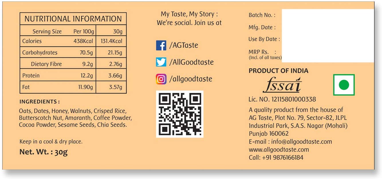 Coffee Date is made of dates, butterscotch nuts, amaranth, coffee powder, cocoa powder, sesame seeds, chia seeds, walnuts and oats mixed with the natural goodness of honey. Its crunchy texture and amazing blend of flavors can help you get throughout the day. These are healthy munchies, better than the calorie-filled snacks which can help keep you energized.