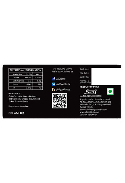 Zesty mixture of Almonds, Chocolate, Black Currants, Crisped Rice, Orange Peel and Chia Seeds bound in honey and oats for a snack that satisfies from the first bite till the very last..